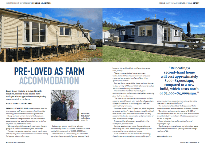 The Spring edition of Country-Wide magazine features Waikato Building Relocators in an article that shines a light on the value of pre-loved homes as farm accommodation. Tom and Becks Jackson share how relocated houses provide a faster, more affordable option than new builds, while still offering comfort, character, and strong “good bones” that can last for generations.