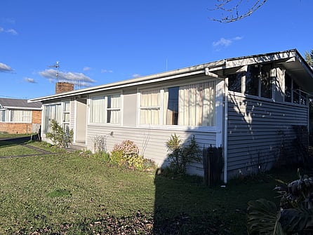 This original 1960s classic home features weatherboard cladding, wooden windows, and solid wooden floors. The house boasts vaulted ceilings and a stunning wall of glass in the living and dining room areas, creating a spacious and light-filled atmosphere. Two of the three main bedrooms also have vaulted ceilings. The home offers a versatile layout, with the potential to combine the existing family bathroom and separate toilet into a large, modern family bathroom. The large kitchen and separate dining area can be opened up to create an open-plan living space, enhancing the home's indoor-outdoor flow through the ranch slider to a large deck. Overall, this charming home measures approximately 100 sqm with a length of 16.2m and a width of 8.23m.